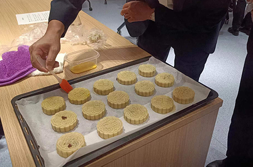 活動(dòng)現(xiàn)場,桌上早已備好紅豆沙餡、面粉、糖漿、花生油等食材以及電子秤、模具等工具。大家圍成一桌,分工合作,相互配合,一步步做好揉搓面皮、捏皮成型、放入餡料等工序,最后通過模具壓制成型,制作出了造型美觀的月餅?;顒?dòng)現(xiàn)場充滿了歡聲笑語,一派熱鬧非凡、其樂融融的節(jié)前景象。
