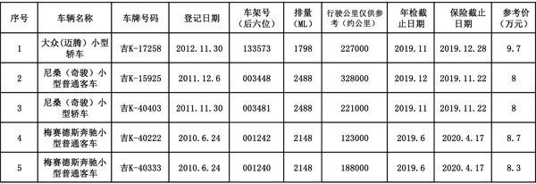 吉林省天池拍賣有限責(zé)任公司受長白山旅游股份有限公司的委托,對以下5臺公務(wù)用車進行公開拍賣: